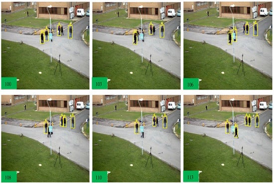 Effectiveness of our tracker in the case of moving camera. Our tracker is effectively tracking the multi-objects without becoming drifted on anchors by camera motion with the small objects inside the scene. The detected bounding box and the unique ID are demonstrated in yellow color.