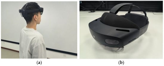 Visual presentation equipment and experimental scene: (a) subjects wearing the device; (b) Hololens2 display device.