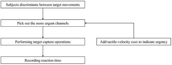 This experiment intends to simulate the operation related to the dynamic channel interface of a holographic aviation tower. It is geared towards the task of judging the urgency of multiple objectives. In this paper, the urgency refers to the time for the target to reach the specified position. Since the target movement speed and distance of each dynamic process are different, when the arrival time is similar, redundancy and misjudgment will occur when relying solely on vision to judge the expected time. By setting up dynamic processes with different intensity stimuli corresponding to different speeds, the correspondence between different tactile intensities and different speed movements was investigated. After obtaining this correspondence, the tactile indication is then used instead of speed to indicate the corresponding target of the most urgent passage at a similar degree of urgency. The specific flow of the experiment is shown in Figure 3.