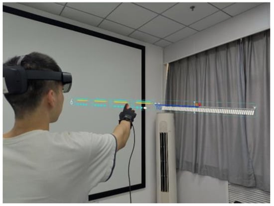 Currently, operators in aviation towers perform control and real-time scheduling of tasks for velocity and position sensing of air targets mainly through dynamic channel interfaces [], which have an important role in air traffic, aerospace engineering, aviation military, and other fields [,,]. The existing dynamic channel control interface consists mainly of a linear motion approach display with graduated line segments, target object cursors, decision point cursors, and related information. The relative motion of the target position point and the decision point is used to show the relative position relationship between the target and the decision point, and when the position cursor representing the target coincides with the decision point, the operator can start the decision. As an important human–computer interaction interface to characterize the target motion condition, the dynamic channel interface has dynamic and intuitive characteristics []. It brings very good interaction effects to trajectory determination, target tracking, multi-target motion perception [,,], and other types of tasks, as well as improving task effectiveness. Additionally, due to the complexity of the real situation and the diversity of system elements [], it is usually difficult for a single dynamic channel to describe the overall motion, and multiple parallel channels are needed for simultaneous sensing and decision-making []. Therefore, there are two types of dynamic process tasks, a multi-process simultaneous sensing task [] and a single-process dynamic accurate tracking task []. This corresponds to two scenarios of multi-target and single-target tasks. In recent years, holographic tower control based on virtual reality and mixed reality devices is entering the daily work of aviation practitioners, and its advantages of easy interaction, large amount of information and full immersion show a good future development trend. As the elements in the mixed reality field of view become more and more, the dimensionality of information is increasing, the pressure of human visual cognition is increasing, and its perception of motion and tracking of the position will become less effective. Multimodal-assisted human–computer interaction is a method of adding other sensory feedback methods to assist visual interaction. It can improve the overall interaction effect and efficiency without adding the burden of visual fatigue []. Studies have shown that tactile has a good cueing and warning effect for situations such as navigation and perceived object movement [,,]. Therefore, the use of tactile assistance to cue visual perception of motion is effective. In this paper, tactile feedback is incorporated in a mixed reality environment to assist the operator in multi-target decision making and accurate tracking. The tactile intensity and different types of tactile schemes are combined with the perception of velocity and position to assist the motion characteristics of targets in MR 3D environments.