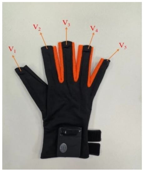 When the time is short, the above equation can be used to describe the intensity of the vibration at the moment. The above principle is aimed at the same position of intensity and stimulation changes. The sequence of vibration is closely related to the vibration position, and when the vibration unit works differently at each different vibration position, it needs to be described and arranged according to certain rules. The five vibration locations of the tactile sensing device in this paper are located at the five knuckles and are shown in the following Figure 7.