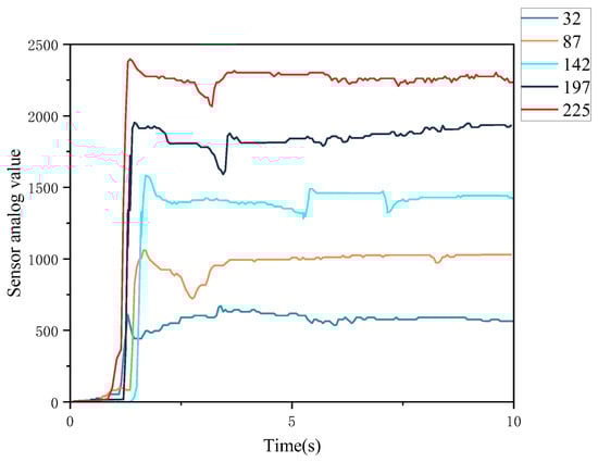 As can be seen from the above figure, when the greater the intensity of vibration, the greater the simulated value of the glove sensor, which also represents the greater the degree of force proceeding, after a period of instability, the simulated value can be stabilized to refer to different intensity effects, so the use of sensor simulation value way to measure the intensity of vibration is feasible. In this paper, we will also continue to select 32, 87, 142, 197, 225 as different values of intensity differentiation, representing low, lower, medium, stronger, and strong vibration stimulation, respectively.