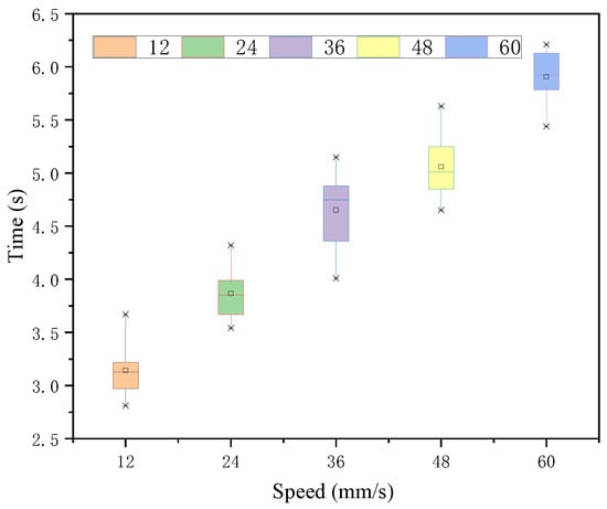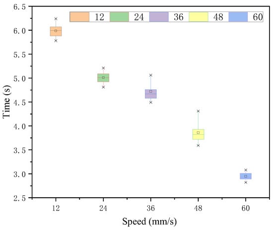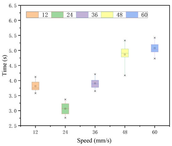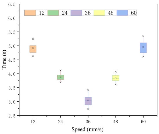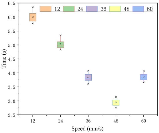 In the case of each speed judgment under 197 intensity stimuli, the Greenhouse-Geisser method of analyzing the time means illustrates that there is a significant difference in the effect of each speed target under this intensity stimulus. As seen in Figure 13 and Table 7, 48 mm/s was judged to be the fastest. The time means of 36 mm/s and 60 mm/s, which had the smallest and equal difference with 48 mm/s, were slightly larger than those of 48 mm/s and their time means were close to each other with no significant difference, while the response time means of 12 mm/s and 24 mm/s, which had a larger difference, were also similar and had no significant difference. The variance of their time means was tested for no significant difference.