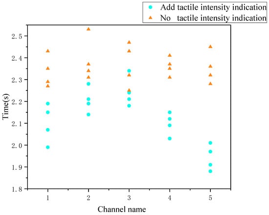 As can be seen, channels 1 and 5, as the boundary values of the corresponding intensity cues, have a clearer effect on the subjects. Subjectively, the subjects were able to identify them better. The third channel is the middle value of the tactile vibration, and the subjects’ perception of it is somewhat ambiguous. This led to a less obvious optimization effect in this channel. The channel 5 and channel 1 time mean is 15.46%, 6.25% lower than channel 3 time with median intensity. Channels 2 and 4, as the transition channel between the boundary value and the intermediate value of the vibration intensity, also had a response efficiency between the two. The response rate of the subjects was faster when the tactile vibration intensity was higher (channels 4 and 5) than when the vibration intensity was lower (channels 1, 2, and 3). Overall, the addition of tactile intensity stimuli aided subjects well in the operation and perception of the urgency judgment task.