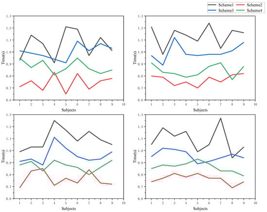 The raw data under the different indication schemes for each subject were subjected to significance analysis: adjusted F values obtained after one-way ANOVA for the response times at the four-time monitoring points for each subject of Scheme 1 F(2.47,7.40) = 0.299, p = 0.791 > 0.05, adjusted F values for each subject in Scheme 2 F(1.65,4.94) = 0.430, p = 0.640 > 0.05, adjusted F values for each subject in Scheme 3 F(2.19,6.56) = 1.000, p = 0.425 > 0.05, adjusted F values for each subject in Scheme 4 F(2.59,7.73) = 0.507, p = 0.664 > 0.05. It indicates that there is no significant difference in judgment time between individual subjects, and that the variability of different people can be disregarded when conducting mechanistic studies, and only the cognitive characteristics of people as a group can be considered.