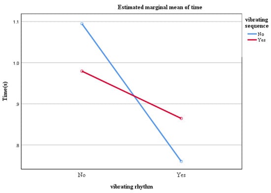Following the scenario design in the methodology in Section 2, the presence and absence of vibration rhythm and the presence and absence of vibration sequence were used as statistical elements to distinguish the four scenarios, i.e., scenario 1 was no rhythm and no sequence, scenario 2 was rhythm and no sequence, scenario 3 was no rhythm and sequence, and scenario 4 was rhythm and sequence, provided that the vibration location was always present. For the presence and absence of rhythm and the presence and absence of sequence, a between-subjects two-factor ANOVA was performed on the temporal data for each scenario: where the dependent variable was response time, and the independent variables were vibration rhythm (presence and absence) and vibration sequence (presence and absence). The results showed that the main effect of vibration rhythm was significant, F(1,140) = 406.19, p = 0.00 < 0.05,, according to the evaluation criteria given by Cohen [], the effect value is large where the reaction time of the cueing scheme with vibrational rhythms involved was significantly smaller than that without rhythms. The main effect of vibrational sequence is not significant, F(1,140) = 0.24, p = 0.628 > 0.05,, the effect value is small. The response time with the vibration sequence cue was slightly smaller than that without the cue but the difference was not significant. The interaction of rhythm and sequence is significant, F(1,20) = 96.96, p = 0.00 < 0.05,, the effect value is large. For the overall cue, the vibration rhythm can improve the response efficiency with or without the vibration sequence, but the improvement effect is better when there is no sequence; while in the premise of the vibration rhythm, adding the vibration sequence cue will reduce the response efficiency, which reflects that too many tactile cue elements will cause redundancy to human cognition as shown in Figure 18.