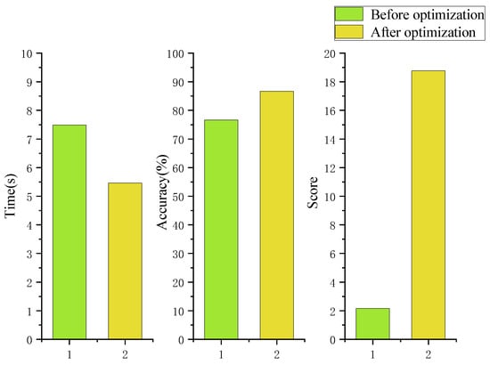 The final correct rate and reaction time were brought into the above equation to obtain a combined performance score of 18.77 after tactile optimization and 2.16 before optimization. The combined correctness, response time, and score of the combined experiment are displayed in order in Figure 21.