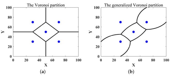 This paper considered coverage control with respect to the time cost metric. Inspired by Voronoi division [9,35], which is based on the principle of proximity as shown in Figure 1a, the task area Q was divided using the principle of shortest time, called the generalized Voronoi partition, as shown in Figure 1b: