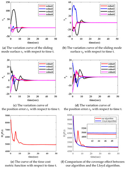 In Theorem 1, the lower bound of the control input is given in (17), which has already satisfied the condition (21). Similarly, can be obtained within a fixed time . Therefore, the robot network can achieve the optimal position configuration in a fixed time, and the time optimal coverage effect for the task area is achieved. □