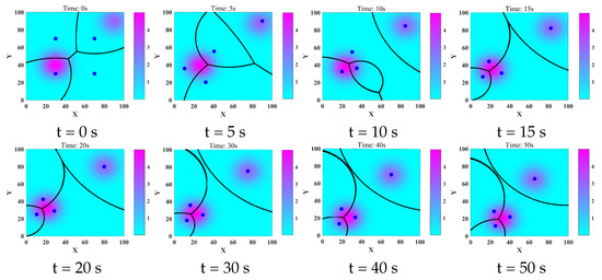 We compared the proposed control algorithm (13) with the classical Lloyd algorithm [9,26]. The time evolution of the TCMF is shown in Figure 3e. In Lloyd’s algorithm, the control proportionality coefficient was set as 0.4, so that the two algorithms made the decrease rate of the metric function almost equal to the initial time. Figure 3f shows the comparison of the two algorithms. It could be noted that the control algorithm (13) could make the metric function smaller, therefore, the control algorithm had a better effect. The coverage evolution process of the robot network is shown in Figure 4. The distribution of the robot network was random at the initial time. Then, the robot network moved to the optimal position configuration and maintained the optimal coverage effect, despite several important objects in the area that were constantly moving.