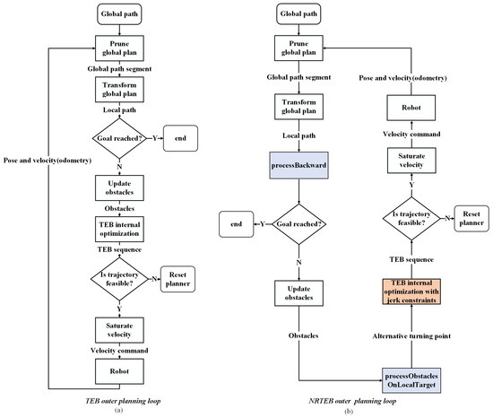 Workflow comparison. (a) is the workflow of the TEB method. (b) is the NRTEB workflow. The two modules in blue represent improvements in the outer planning loop, corresponding to contributions 3 and 4. The orange module represents improvements in the inner planning loop, corresponding to contribution 2.