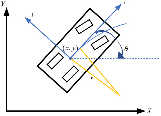 where is the configuration space state, is a two-dimensional Cartesian coordinate, denotes the heading angle of the robot, v is the longitudinal speed, is the front steering angle, and L is the wheelbase of the vehicle.