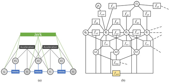 With the above definition, the multi-objective problem is transformed into a graph optimization problem, where four poses and three time intervals constitute the minimum hyper-graph considering jerk, as shown in Figure 3a. A simplified example structure of the NRTEB hyper-graph is shown in Figure 3b.