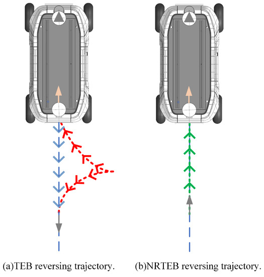 This paper has already explained the shortcomings of the original TEB in reverse planning in Section 2.3. Due to the problem of local target reference heading, TEB always tries to generate a parking trajectory when the global path is behind the vehicle, as shown in Figure 4a. This reversing strategy is extremely unsafe in narrow roads. To enhance the safety and robustness of reversing planning, this paper intends to solve the problem from local trajectory planning cycle instead of the global planning module. When the global path is behind the vehicle and the robot is far from the global target, NRTEB is able to generate a direct reversing trajectory, as shown in Figure 4b. When the robot approaches the global target, it takes this goal as the end point of optimization. As such, the robot’s terminating heading problem is also solved.