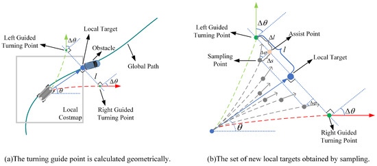 Firstly, as shown in Figure 6a, the NRTEB planner calculates the direction vector from the robot to the local target , then make a vertical line of the direction vector across the local target, finds the location of the possible guided turning point on the vertical line based on the amount of lateral displacement change l and angle change . The green dashed line is the expected obstacle avoidance trajectory after updating the local target. The coordinates of the old local target are known: , the pose of the left guided turning point is obtained from the geometric relationship as: