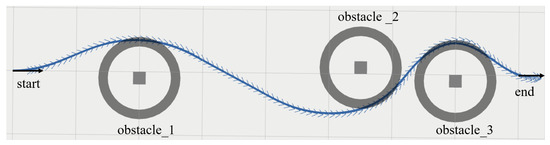 The motion planner usually updates the trajectory according to a certain frequency, so the trajectory has been dynamically varying as the robot moves and the environment changes. In order to accurately compare the motion performance of trajectories generated by different motion planners in the same environment, the start and end point are fixed to simulate the robot position and local target. Furthermore, three static obstacles are added in the direction of their motion. The posture of the planning start is . The posture of the planning end is . All three obstacles are 0.2 m × 0.2 m × 0.2 m cubes, which are located at , , and , respectively. The planning parameters of the motion planners are shown in Table 1. The trajectory generated by NRTEB is shown in Figure 8.