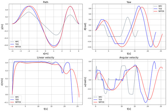 The motion performance of the trajectories generated by the three planners is shown in Figure 9. All three methods generate the correct obstacle avoidance path where MPC has the closest distance to the obstacle and the highest collision risk, but can reach the end point faster. While the paths generated by TEB and NRTEB are relatively safer. The speed profile of TEB and MPC is steeper and the yaw change is more rapid, which poses a more stringent challenge to the tracking stability. In contrast, the NRTEB has the smoothest speed profile, which significantly reduces jitter and oscillation during travel. This is important for logistics robots to avoid shaking and thus ensure the integrity of the products.