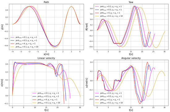 This paper also explores the effect of planning parameters on the performance of the NRTEB planner for trajectories. The different jerk bounds or optimization weights are set to compare the planning performance in the same environment, respectively. The results are shown in Figure 10. The tighter the jerk constraint, the greater the fluctuation of the planning path. It can be seen from the heading angle, linear velocity, and angular velocity curves that the tighter the jerk limit, the smoother the curve, and the longer the motion time at the same time, where the motion curve is smoothest for a jerk threshold of 0.1 and steepest for a jerk threshold of 4. An increase in the optimization weight of jerk further improves the motion smoothness and motion time. In this paper, we suggest that the constraint range of jerk is between 0.1 and 5, and the optimization weight of jerk is between 1 and 10. If there is a higher requirement for the motion time, the optimization weight of the trajectory motion duration can be further adjusted upward, thus making a balanced trade-off between motion smoothness and motion time.