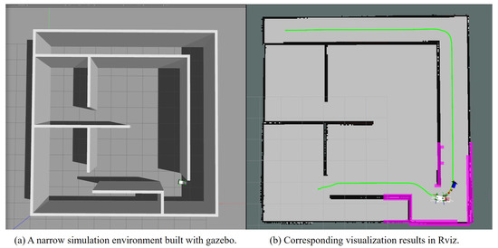 Tracking the global path is an important goal of motion planning. The tracking error between the actual vehicle trajectory and the global path is an important indicator of planning performance when there is no obstacle interaction during navigation. A car-like robot model developed by MIT named racecar (https://github.com/mit-racecar/racecar, accessed on 28 February 2017) and a simulation environment built using Gazebo (https://github.com/osrf/gazebo, accessed on 15 January 2010) were used to conduct comparative experiments on tracking performance under Robot Operating System (ROS) (https://www.ros.org/, accessed on 23 May 2018). The vehicle is equipped with a single-line LIDAR on top to sense the surrounding environment obstacles. The environment size is 10 m × 10 m. The real-time motion state of the robot is feedback by the gazebo simulator. The global path is provided and recorded using the A* algorithm, and the same global path is kept published during the experiments. The simulation environment containing narrow corridors is shown in Figure 11. The key parameters for the simulation experiments are shown in Table 2. All parameters do not exceed the kino-dynamic constraints of the car-like robot model.