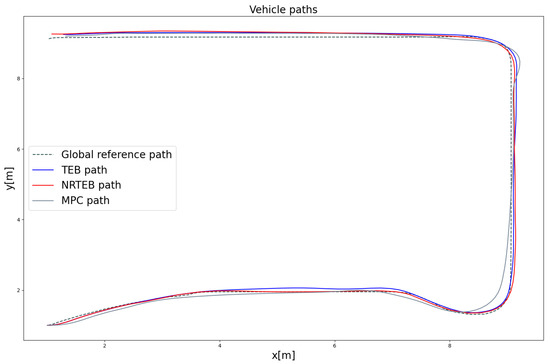 Firstly, the pre-recorded global path is published, and different motion planning algorithms are used to generate local motion trajectories. Then, the motion state of the robot is recorded in real-time from the starting point to the global target with a frequency of 2 Hz. The traces of the robot’s odometry are shown in Figure 12. The results of the actual robot path length and average lateral tracking error are shown in Table 3. Among them, MPC generates the shortest tracking path but has the largest tracking error, which makes it significantly riskier to collide with walls at the corners of narrow roads. TEB and NRTEB have a smaller tracking error, which allows the robot to stay in the middle of the narrow road. NRTEB requires a larger turning radius because it limits the jerk, but does not significantly affect the tracking performance.