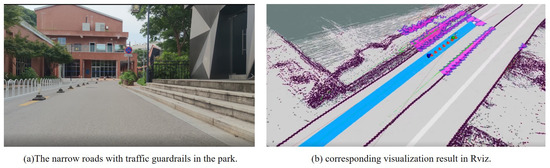 The AGV is tested on a 2.75 m-wide road with traffic guardrails. The planning parameters of NRTEB are shown in Table 7. When the vehicle is driving in the middle of the road, its distance from the edge of the road is m, so set l to 1.0. According to Equation (20), the maximum value of is , so choose as 60. Our system integrates with the global road network planning module in Autoware (https://www.autoware.org/, accessed on 1 August 2015) to provide a global reference path. Figure 15a shows the real environment captured by the camera, while Figure 15b shows the visualization of the AGV in Rviz.