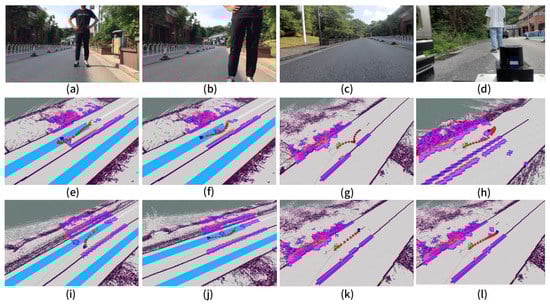 Real-world experimental results. (a–d) Are the pictures captured by the camera, (a,b) perform obstacle avoidance tests with pedestrians. (c,d) Are taken by the camera fixed on the back of the AGV. (d) Is used to test reverse obstacle avoidance. (e–h) Are the screenshots taken from Rviz when running TEB planner. (i–l) Are the screenshots when running the NRTEB planner.