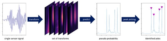 In the present work, Continuous Wavelet Transforms (CWTs) were used because they are generally an effective tool for analysing acoustic and visual signals []. In addition, previous work has shown that CWTs are an effective tool for axle identification [,,,,].The wavelet transformed signals are subsequently analysed using a Fully Convolutional Network (FCN) that is trained in a supervised manner to perform a binary classification task (Figure 1). As a result, the model outputs a pseudo-probability for each time step, whether a train axle is located above the sensor of the input signal at this time. A peak-finding algorithm is then used to classify the pseudo-probabilities into axle (peak) or no axle (no peak). This enables the processing of signals of arbitrary length without the need to divide them into time windows. Furthermore, analysis in this way is not limited to certain mother wavelets or specific scales, as in the previously mentioned work that used the CWT [,,,,].