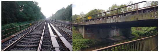 We recorded the measurement data used in the present study on a single-span steel trough railway bridge (Figure 2) located on a long-distance traffic line in Germany. The single-track bridge with a ballasted superstructure was built in 1969 and has a total length of 18.4 m, with a free span of 16.4 m (Figure 3).