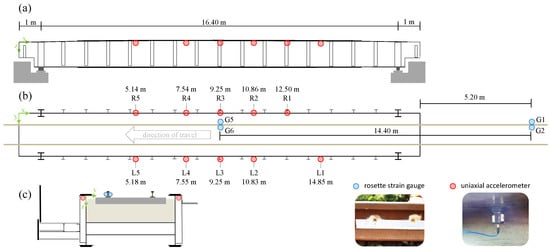 Bridge and sensor setup: (a) side view, (b) top view with sensor labels, accelerometer x-ordinates, and strain gauge distances, (c) cross section.