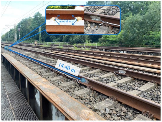 By means of two wheel load measuring points, the average velocity of each axle was determined, and from this, the actual position of the axles during the passage was deduced. Every measuring point involved the installation of at least one pair of rosette strain gauges (HBM 1-CXY41-6/350HE) on the rails. Each pair of strain gauges were placed at the level of the neutral axis of the UIC 60 rail profiles with a distance of 20 cm and allowed for the recording of bi-axial strains at an angle of 45° with respect to the neutral axis (Figure 4). Thus, shear strains were obtained. The difference of the shear strains allowed us to determine the acting wheel loads. For further details, please refer to []. To compensate for the influence of the lateral wheel loads, a pair of strain gauges was placed on each side of the rail, such that one wheel load measuring point retrieves two signals.
