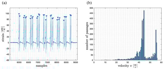 The peaks of the wheel load measurement signals were automatically identified (Figure 5a). All passages where the two wheel load measuring points had not detected the same number of peaks were discarded. This led to 3745 usable recorded passages out of a total of 3787, i.e., about 98.9%. Using the temporal differences of the peaks at the two measuring points and the known distance between the wheel load measurement points of 14.40 m, the mean velocity could be determined for each axle. The trains reached a maximum velocity of about 57 m/s (Figure 5b).