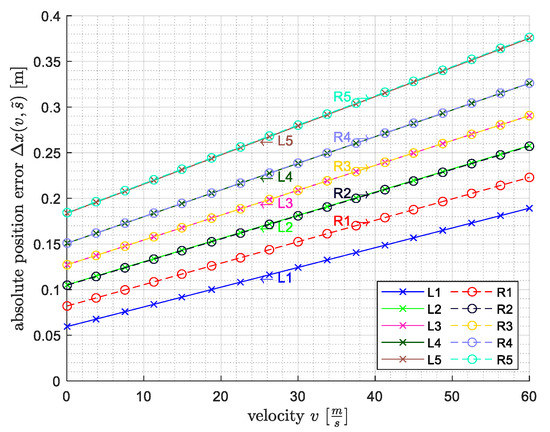 In the next step, by using the known distances—from the first wheel load measurement point to each of the ten accelerometers—and the mean velocity of each axle, the time at which the axle was at the same x-ordinate as the respective sensor could be calculated. Since the two strain gauges of one wheel load measuring point had a distance of 20 cm between them, the uncertainty with respect to the distance between the two wheel load measuring points was assumed to be . This propagated through the velocity determination. Together with an uncertainty in time of , the absolute spatial error from the linear error propagation for each sensor (Figure 6) was calculated as follows:
