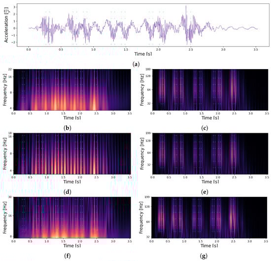 As a result, all 6 transformations were used in combination (Figure 7b–g). To create the final model inputs, each signal (per passage and per sensor, shown in Figure 3) was transformed according to our 6 settings. Afterwards, the transformations were independently normalised and stacked into a three-dimensional array (: number of samples, : number of frequencies/scales, and : number of transformations). Thus, each sensor functioned independently as a VAD, which means that for our ten sensors, our method can locate each axle ten times (ten time points for ten sensor coordinates).