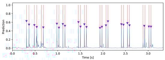 Exemplary output, with the model’s output pseudo-probabilities represented by the blue lines, ground-truth by the red lines, and found peaks by the magenta triangles.