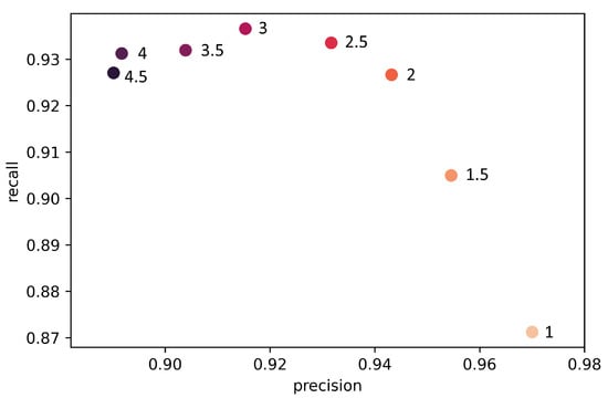 We thus confirmed our hypothesis that our data set is too unbalanced for standard loss functions such as Cross Entropy. The model training with small values of 0 and 0.5 ended in dead ReLUs after 8 or 9 epochs and is therefore unusable. However, the modulation factor should also not be weighted too high to achieve the best performance. The relationship between , precision, and recall can be described as a trade-off between detecting too many axles and detecting too few axles (Figure 10).