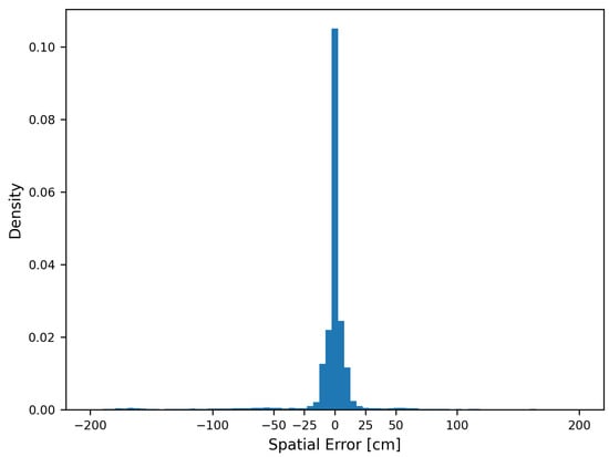 The spatial errors for a threshold of 2 m were mostly at 0 cm, with an almost symmetrical distribution (Figure 11), thus indicating that there is no bias in the VAD. Most values were within a spatial error of 20 cm, and only a few values had an error higher than 25 cm. The maximum labelling error in the velocity range of most passages (30–60 ) was partially even above 25 cm (Figure 6).