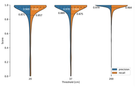 We calculated the precision and recall per passage and sensor for each threshold in order to examine the distribution of the metrics in more detail, which resulted in 3750 values per threshold and metric (Figure 12). The differences in the results with thresholds of 20 cm and 37 cm were small, as even the 25% quantile stayed above 85% for both metrics (Figure 12). Precision and recall for a threshold of 200 cm were much better, with the 25% quantile remaining above 96%, while the mean spatial error greatly worsened by more than double the value compared to the other thresholds (Table 3). Therefore, we conclude that 37 cm is the optimal threshold value required to correctly evaluate the model’s performance. In addition, we consider predictions with a spatial error above 37 cm as outliers. It should be possible for such outliers to be sorted out in post-processing by their comparison with known train configurations.