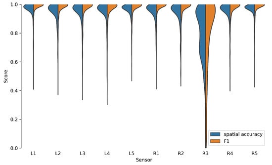 To investigate the influence of sensor placement, we determined the score and the spatial accuracy per sensor. The spatial accuracy was calculated as follows: