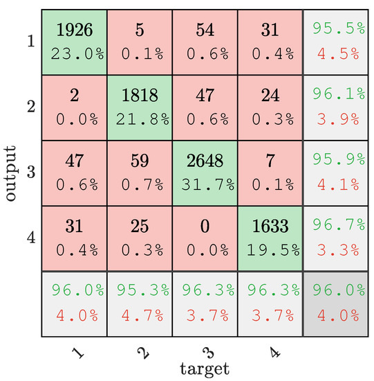 It can be seen from Figure 3 that the accuracy rates of methane, ethylene, air, and mixed gas in the mixed-gas identification are 95.5%, 96.1%, 95.9%, and 96.7%, respectively. The accuracy rate is 96% among 2006 methane test samples, and 96.3% of samples were correctly identified as mixed gas among 1695 mixed-gas test samples. Overall, SSA-SVM correctly classified 8025 out of 8357 test samples. The accuracy rate reached 96%.