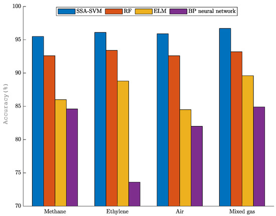 In order to better reflect the mixed gas recognition ability of the SSA-SVM, RF, ELM, and BP neural networks, the accuracy rate of each category under the above methods is calculated. The comparison results are shown in Figure 5. As shown in Figure 5, the SSA-SVM method is better than the other three methods in identifying both single gases and mixed gases.