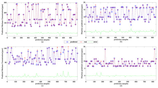 The SSA-SVR gas-concentration prediction results. (a) The predicted concentration of methane under a single gas; (b) the predicted concentration of ethylene under a single gas; (c) the predicted concentration of methane under the mixed gas; and (d) the predicted concentration of ethylene in the mixed gas.