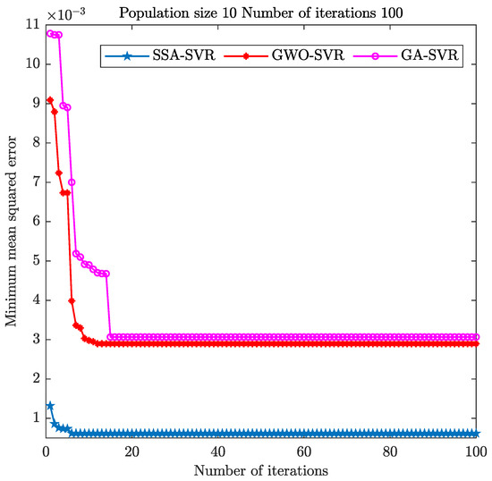 To further validate the regression effect of the SSA algorithm for optimizing SVR, we compared it with the GWO and GA optimization algorithms. The minimum mean square error result is shown in Figure 7. The relevant parameter settings of the GWO and GA optimization algorithms are shown in Table 7 and Table 8.