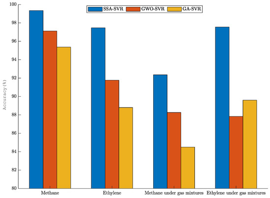 In order to further intuitively reflect the fitting degree of the prediction data of SSA-SVR, GWO-SVR, and GA-SVR, the determination coefficient of each model is calculated. The fitting results of the gas-concentration prediction are shown in Figure 8. Whether for a single gas or a mixture of gases, the concentration prediction fit of SSA-SVR is better than that of GWO-SVR and GA-SVR. The fitting degree of SSA-SVR for single gas-concentration prediction is over 97%. The fitting degrees of SSA-SVR for the prediction of methane and ethylene concentrations under mixed gas are 92.36% and 97.55%.
