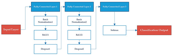 According to LDSA-modified input features, the images were subsequently categorized using a simple DNN. After that, a fully connected (FC) network was utilized for classy crack and non-crack images. Batch normalization layers sped up the training process, while rectified linear unit (ReLU) and dropout were employed to reduce overfitting issues and generalization. Finally, a SoftMax layer composed of two nodes linked to the final FC divided images into two groups. The architecture of this DNN is depicted in Figure 3.