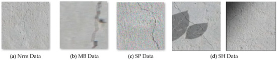 Thus, to construct two versions of the original 3000 image dataset, salt and pepper noise and motion blur are applied to the original data. These images were taken from the surfaces of concrete walls and have been cropped to 256 × 256 pixels. The variant sets are referred to as 3000 SP and 3000 MB image datasets in the rest of this investigation. A noise density of 6% is used for salt and pepper noise and motion blur, the motion duration is set to 20 pixels, and the motion angle is set to 11 degrees. Readers are invited to obtain the dataset and related details in these references [40,41].