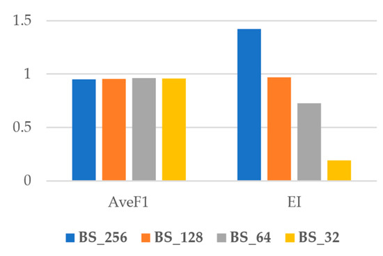 Figure 6 shows the average of the overall F1Score (AveF1) and EI for each batch size. As shown, while the AveF1 is nearly constant for all batches, the EI increases significantly from lower batch sizes to higher ones. Accordingly, we conclude that using higher batch sizes is more efficient as the computation time drops dramatically for higher batch sizes, but at the same time, the accuracy does not change.