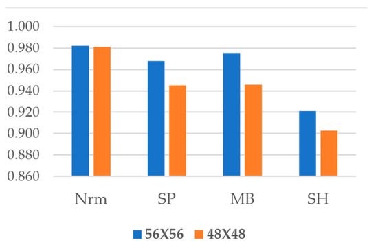 The size of images can have an impact on training performance. As a result, in this section, we challenge the stability of the proposed approach. In the previous investigation of this paper, the input image was 64 × 64 pixels. In order to see the impact of input image size, in this section, the image data sets are resized into two different sets, including 48 × 48 and 56 × 56 pixels. Likewise, before, the classification was conducted via FastCrackNet, and the results are compared.
