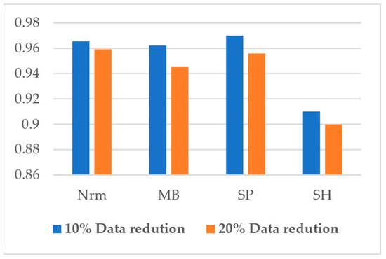 As seen in Figure 7, the normal data experienced the least variance owing to sample changes and achieved almost the same level of accuracy. FastCracknet’s accuracy does not fall below 0.90 in either of the reduced scenarios.