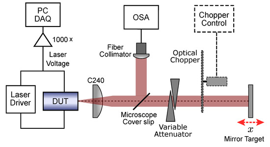 The experimental setup is shown in Figure 2, with the device under test (DUT) representing the position of the two tested lasers. The 850 nm VCSEL (Litrax LX-VCS-850-T101) was operated at 35 C ( mA), and the 852 nm DFB (Eagleyard Photonics EYP-DFB-0852-00150-1500-SOT02-0000) was operated at 25 C ( mA). In both cases, the laser beam was collimated using a lens (C240 Thorlabs) onto a mirror mounted onto a precision piezoelectric actuator stage (PI P-752 11C) driven by a piezo controller (PI E-665 CR). The efficacy of the collimation was tested using a shearing plate that allowed for precise collimation (deviation from true collimation produced markedly different results). A variable dual-wedge attenuator was used to control the feedback levels (Newport 925B), and a microscope cover slip was use to sample the beam (6% reflection at 850 nm) and fed into a optical-spectrum analyser (OSA) (Agilent 86140B). Laser drive current and temperature were controlled with a combined laser driver temperature controller (Arroyo Instruments 6305 ComboSource). The signal was obtained from laser terminal voltage passed through a custom built differential input variable gain amplifier, and was averaged 16 times for all measurements.