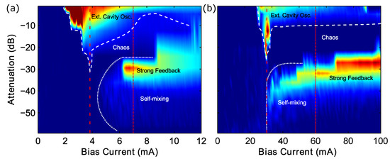 From the first experiment, we obtained a mapping of the SM signal strength in terms of the peak-to-peak of the fringes/waveform vs. the drive current of the laser vs. the feedback level (controlled by the attenuation). These mappings show a wide range of phenomena for both the VCSEL (Figure 3a) and the DFB laser (Figure 3b). Both show the effects of the SM phenomenon from low to strong feedback, the descent into chaos, and the establishment of external cavity modes (and external cavity operation). The precise alignment of the external cavity allowed for these observations to be observed at nearly the same coupling conditions (dBs) reported for the theoretical evaluations of the feedback regimes. Notable differences were in the onset of the external cavity modes/operation, and when the SM signal started at around the threshold. The VCSEL showed a pronounced delay after the threshold in the onset of SM (also observed in [68]), while the DFB seemed to start immediately at the threshold [22]. Both lasers showed a decrease in the threshold when establishing external cavity modes/operation with the extra light reinjected into the laser cavity from the external mirror, essentially reducing the required current for lasing to occur.